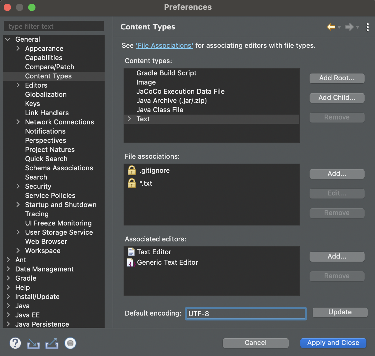 2. General > Content Types > Text > Default encoding : UTF-8 입력 후 Update > Apply and Close